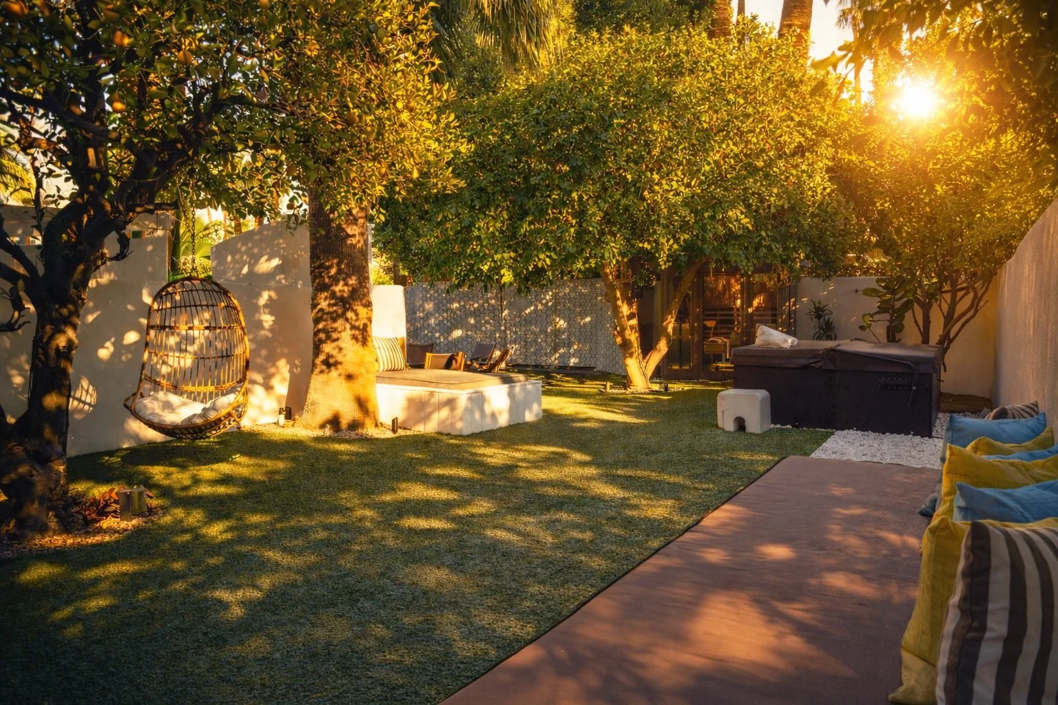 In our central garden, a 15-foot bench wraps around a cluster of towering palms, creating a shaded gathering place beneath the desert sky. Nearby, French bistro tables and cushioned daybeds invite you to linger over coffee, sip a fresh cocktail, sink into a good book—or simply recharge in the warmth of the afternoon light.