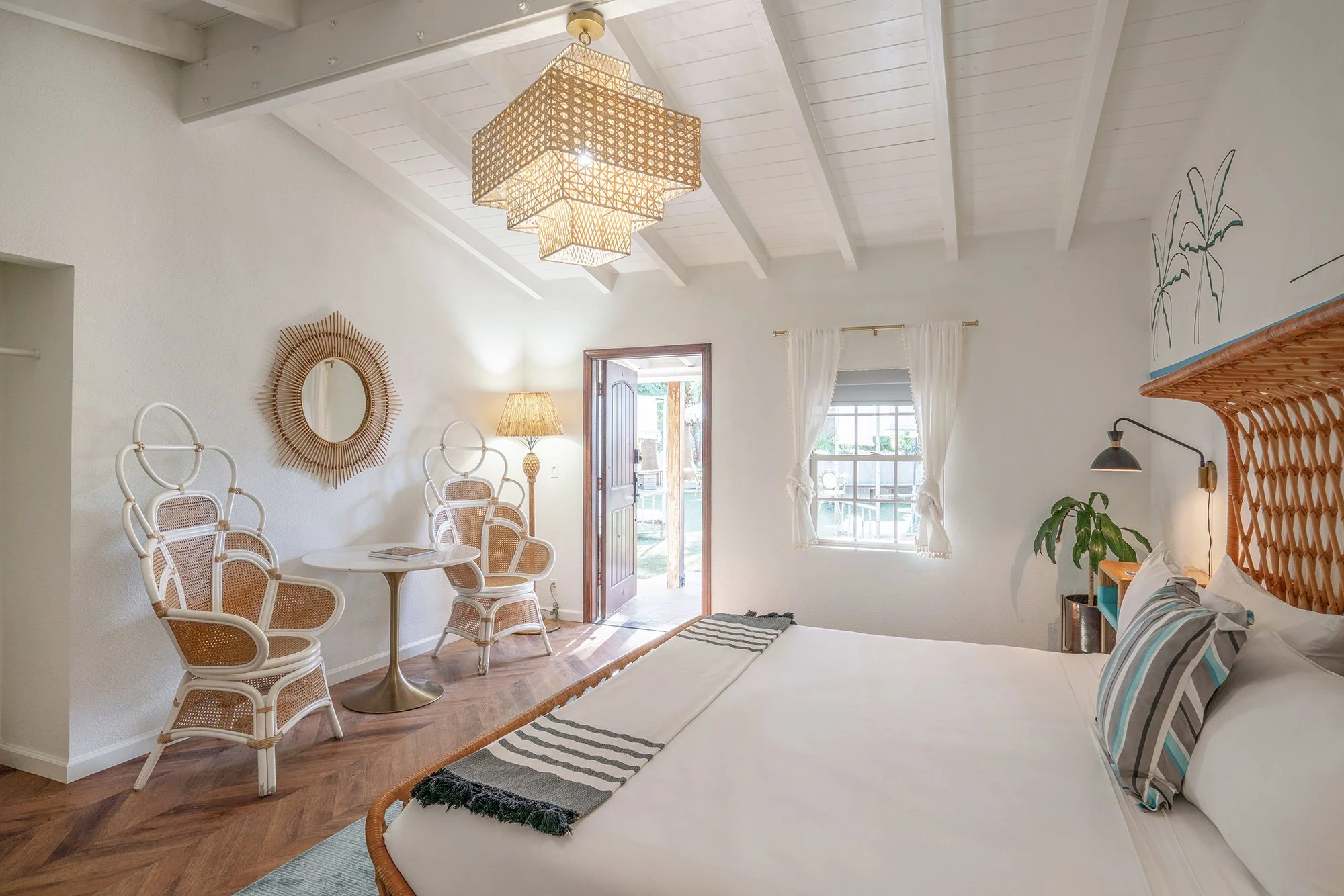 Bright and minimal, Le Soleil is a garden-facing king room inside one of Palm Springs’ most distinctive boutique hotels. A Belgian linen king bed atop a luxury mattress sits against a palette of teal-mint tile and soft Riviera tones, creating a room that feels fresh and quietly restorative. Though there is no patio, the tucked-away location adds privacy and calm. Original artwork, vintage furnishings, a rainfall shower, robes, L’Occitane bath products, bedside charging, and a stocked minibar complete the stay.
