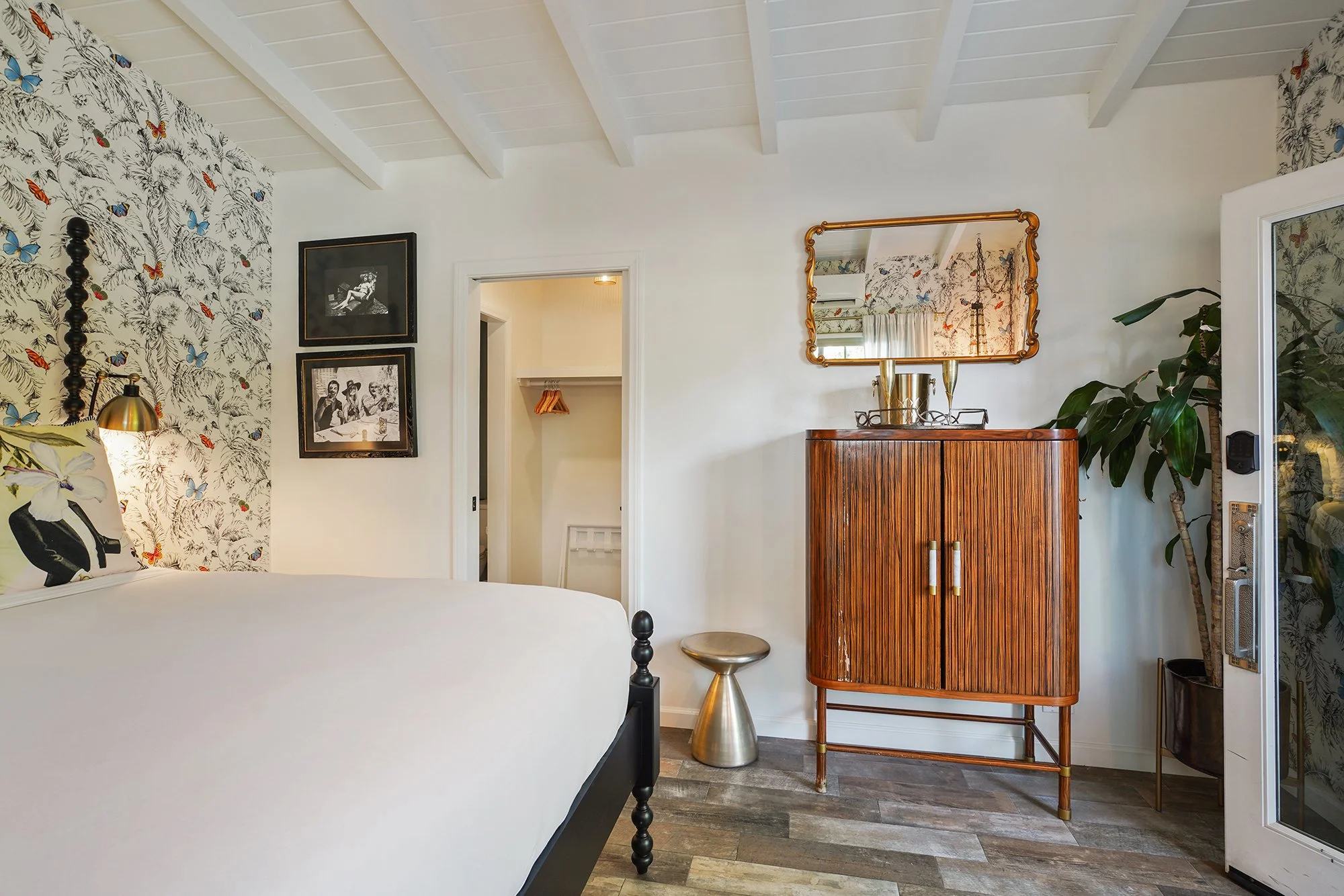 Paris blends bold design and privacy inside a Palm Springs hotel known for layered interiors and quiet luxury. A Belgian linen king bed atop a luxury mattress sits alongside Christian Lacroix butterfly wallpaper, while teal-mint tile and a double vanity give the bath added character. A private street entrance and front patio with bistro seating make the room feel residential and distinct. A rainfall shower, robes, L’Occitane bath products, bedside charging, and a curated minibar complete the stay.