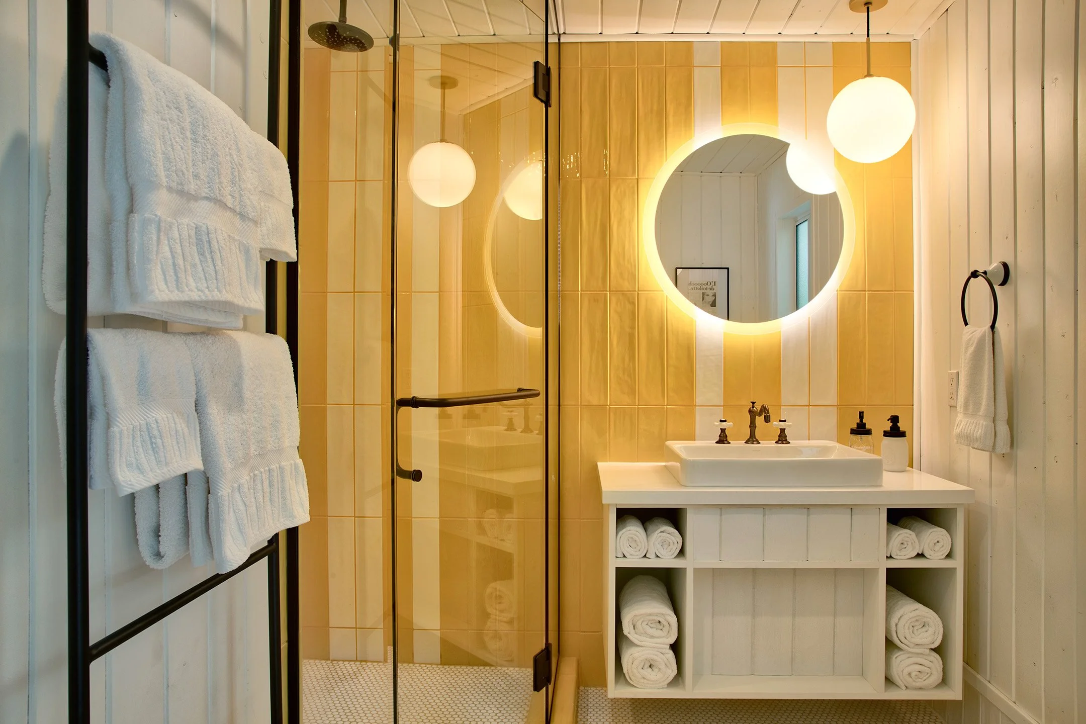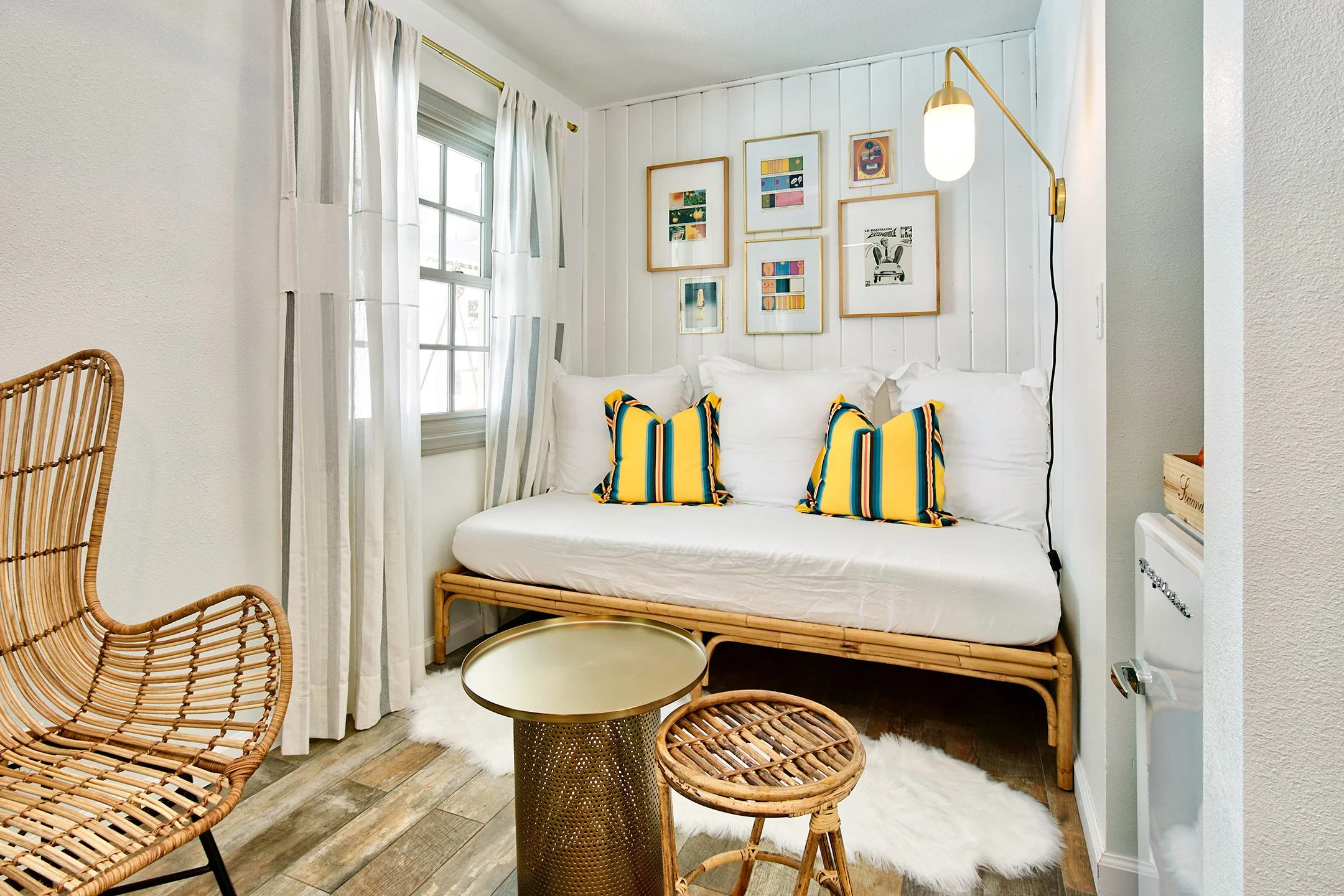 Bright and residential in feel, The Saint-Tropez Suite offers extra space inside this Palm Springs hotel inspired by Riviera ease. A king bed and twin daybed sleep up to three guests, with Belgian linen atop a luxury mattress adding comfort for longer stays. Yellow tile and warm coastal accents bring energy to the suite, balanced by original art and vintage details throughout. A private back patio with bistro seating extends the room outdoors, creating an easy rhythm between morning coffee, afternoon reading, and evening quiet. A rainfall shower, robes, L’Occitane bath products, and a stocked minibar complete the stay.